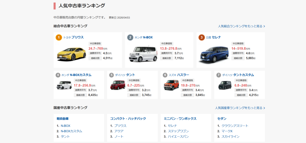 初心者でも使いやすく、情報の分かりやすさ・検索のしやすさ・安心感のバランスが非常に優れています。初めての車選びで失敗したくない方にとって、最もおすすめできるサイトです。
