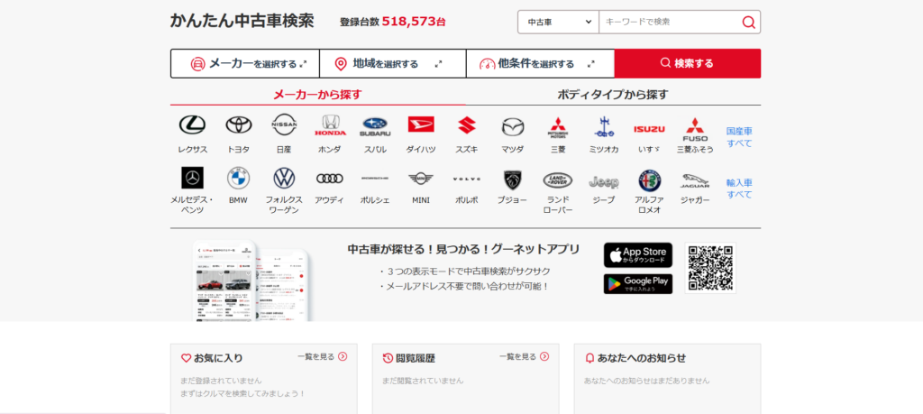 グーネットは中古車情報の掲載数と情報の充実度で評価されているサイトです。車両情報に加えて、レビューや特集記事なども豊富に掲載されており、購入前にしっかり情報収集ができるのが特徴です。