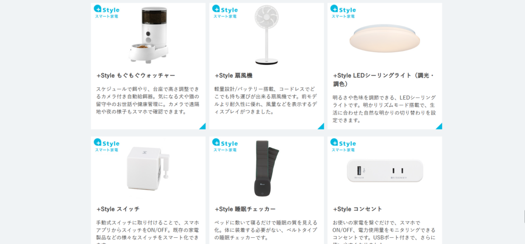 +Styleは、スマート家電を中心に幅広い製品ラインナップを展開しているサービスです。照明・カメラ・センサーなどを組み合わせて、家庭全体をスマート化できるのが特徴です。