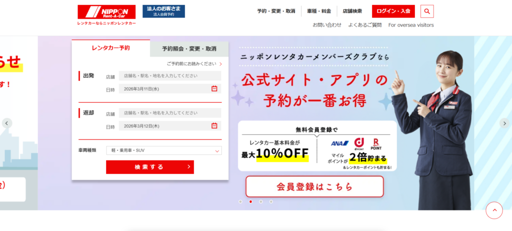 | 4位 | ニッポンレンタカー | 4,800円〜 | 全国展開 | 割引あり |