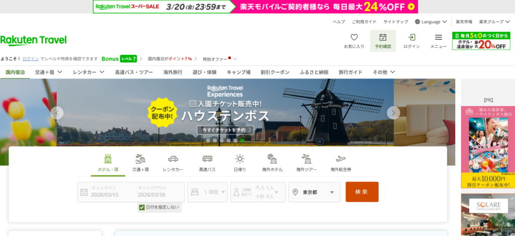 楽天トラベル28,000円〜オンライン予約ポイント還元